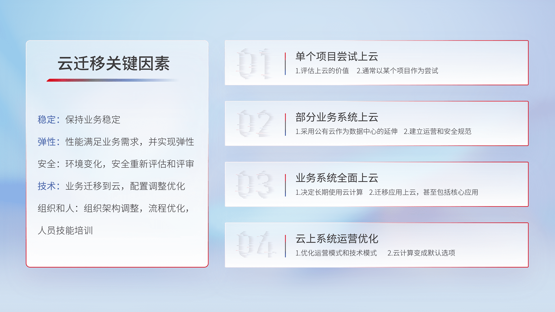 结合实际业务,,,,从规划设计、、、、云平台选型、、、云原生改造、、、、数据迁移、、、、集成交付,,迁移全过程为客户识别最佳上云路径,,做好风险识别管理,,,,设计网络架构、、、身份权限、、安全审计合规、、、、操作审计、、、、日志审计、、、监控告警策略、、多站点容灾设计等,,对云上基础设施进行整体规划,,,,提升IT治理水平,,,以满足弹性、、高可用、、、高性能的需求。。。。