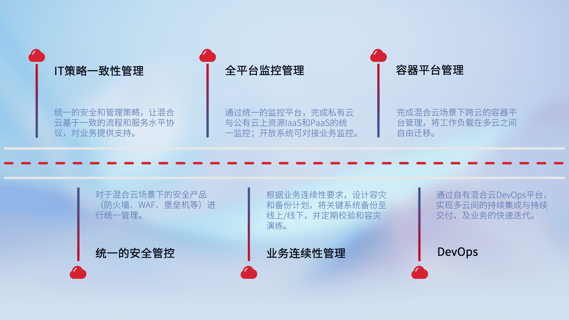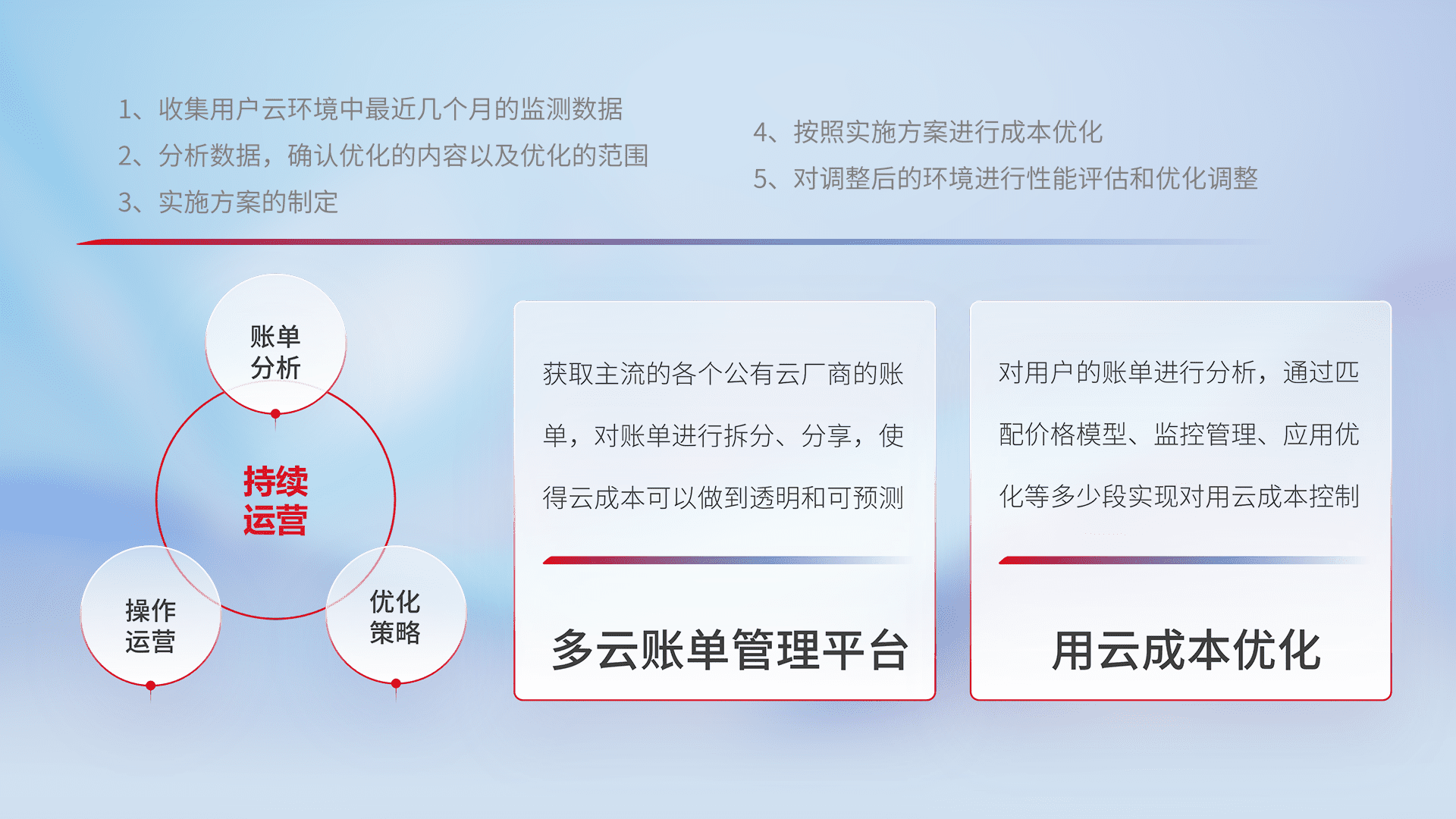 通过多云纳管,,,,以统一的资源数据模型把客户的云资源进行抽象和封装,,进而实现对多云资源的统一操作,,,,保障云资源管理的可靠性、、、、稳定性与可用性。。。量身定制化运维内容,,,配置、、、、开发运维、、、、补丁管理、、、备份、、监控、、、认证和访问管理、、、审计和日常巡检等,,,保障在用云过程中的可靠度,,稳定度以及高可用率。。