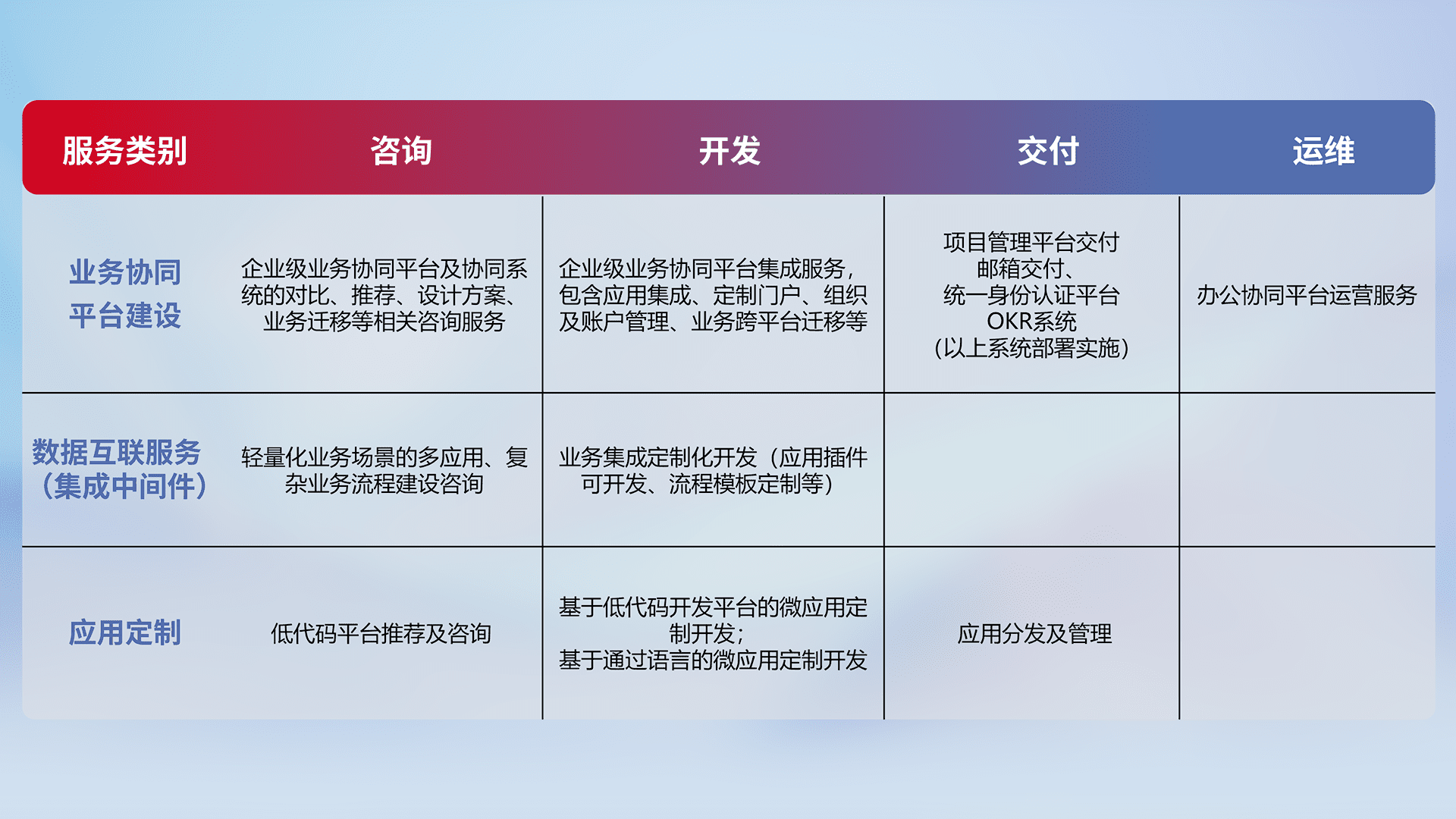 针对钉钉、、、企微、、、IDaas等平台级产品提供产品的规划、、、、方案、、交付、、、定制化开发等服务,,,,实现如统一协同办公、、智能客户服务、、、、混合会议管理、、、智能数据查询、、、、等业务场景,,,实现数字化转型。。。